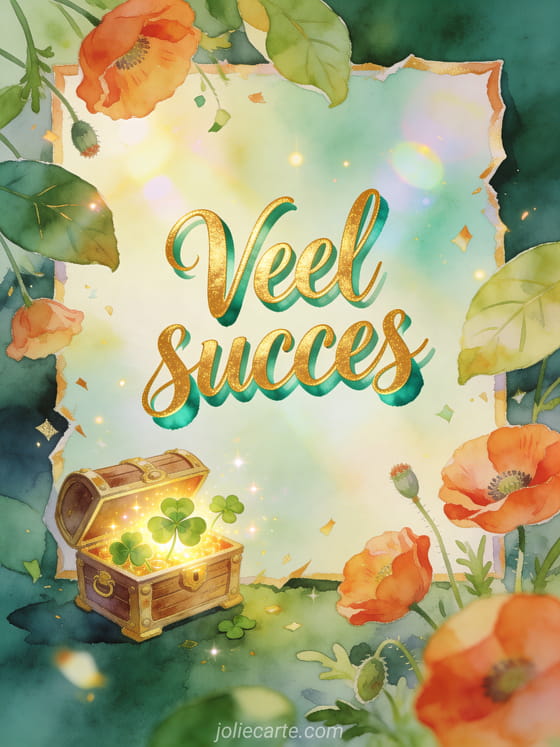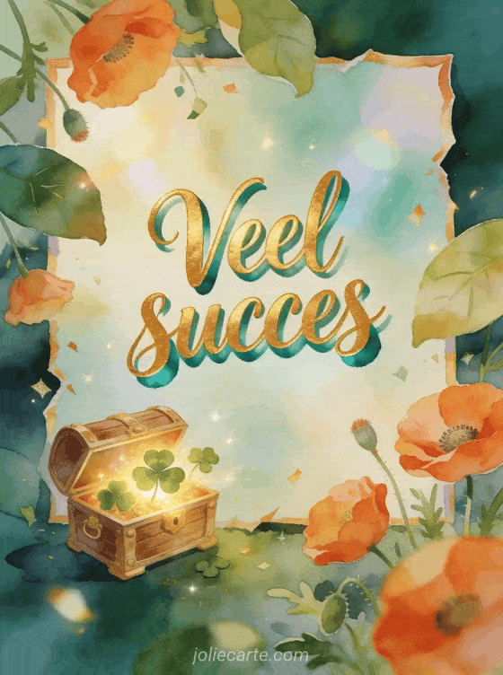 Wens veel succes met een kleine schatkist die gloeit met geluksklavers, klaprozen en brede bladeren in stralend aquarellicht. Je kunt ook veel succes allemaal afbeelding, een bericht om iemand veel succes te wensen of een succes voor de examens afbeelding sturen.