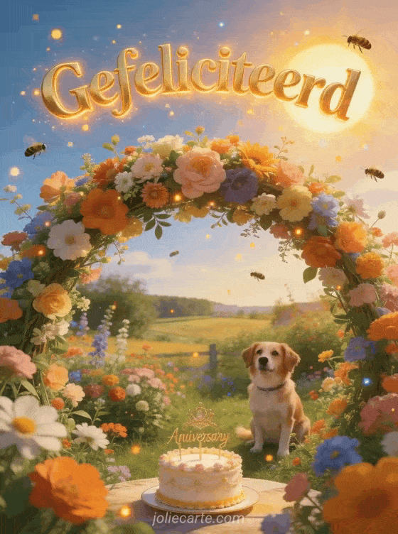 Stuur een vrolijke geanimeerde verjaardagskaart met een schattige golden retriever in een bloemrijke zomertuin. Bekijk ook een mooie geanimeerde kaart gefeliciteerd of een gratis geanimeerde virtuele kaarten gefeliciteerd.