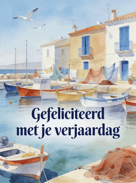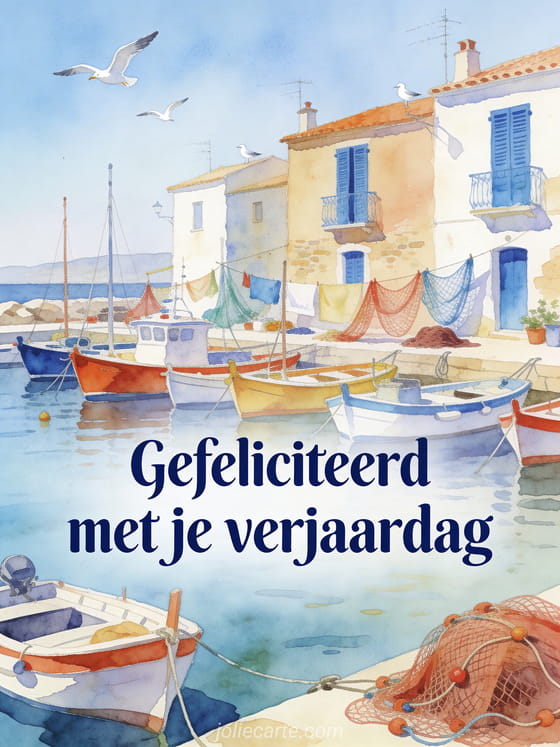 Verrast hem met deze poëtische waterverf kaart op zijn verjaardag. Een schilderachtige vissershaven met kleurrijke boten, huizen met blauwe luiken, visnetten in de zon en meeuwen in vlucht in Mediterraan licht. Ontdek ook een wensen verjaardag man of een geanimeerde afbeeldingen gefeliciteerd verjaardag man.