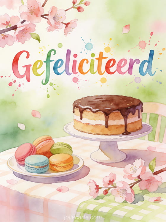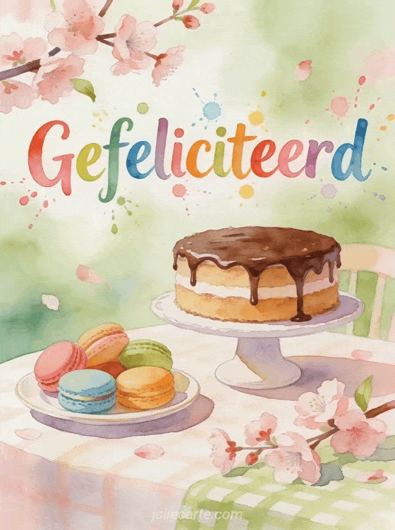 Deel deze fotorealistische kaart met chocoladetaart, kleurrijke macarons en kersenbloesem voor een frisse viering. Bekijk ook gefeliciteerd geanimeerd, gratis geanimeerde verjaardagskaarten volwassenen en gratis geanimeerde verjaardagskaarten dromadaire.
