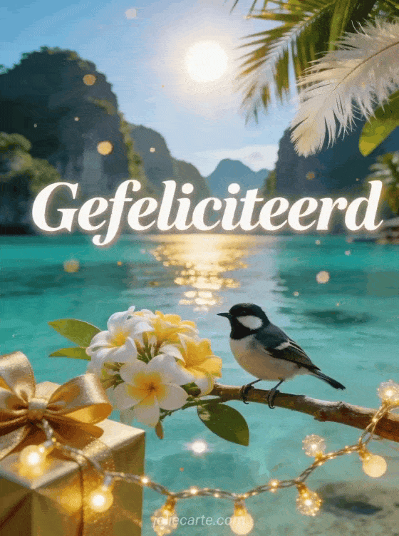 Stuur een mooie geanimeerde verjaardagskaart met een turkoois lagune, een koolmees op een frangipanitak en gouden feestlichten. Bekijk ook een geanimeerde verjaardagskaart hond of een mooie geanimeerde kaart gefeliciteerd.