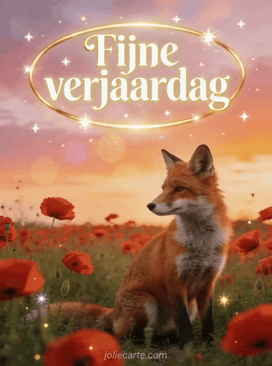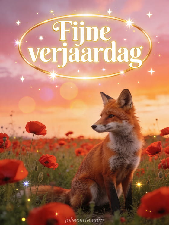 Deel een poëtische verjaardagswens met deze warme geïllustreerde kaart met een rode vos in een klaprozenveld, fonkelende sterren en gouden schemerlicht. Ontdek ook geanimeerde verjaardag e-card, gratis geanimeerde verjaardagskaart bloemen en dromedaris verjaardagskaart geanimeerd gratis muzikaal per sms.