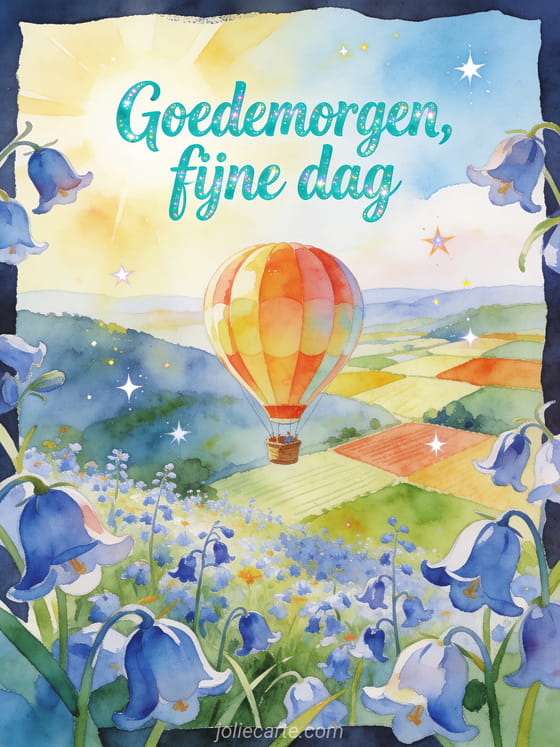 Stuur een geanimeerde virtuele goedemorgen kaart met levendige turquoise aquarelletters, een heldere luchtballon boven een vallei met klokjesbloemen en lappendekenvelden. Ontdek ook een goedemorgen bericht voor mijn vriendin, gratis goedemorgen kaarten of goedemorgen kaarten voor vrienden.
