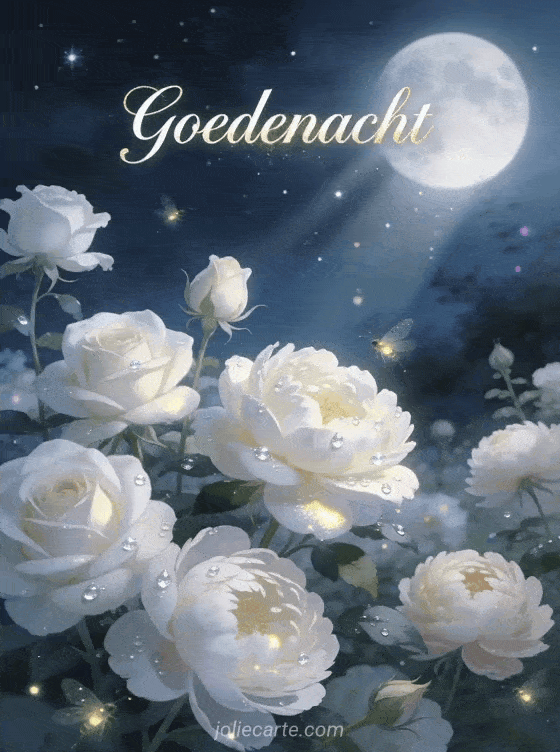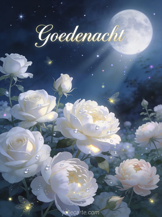 Stuur een prachtige goedenacht gedachte groet via deze gratis wenskaart. Een dromerige tuin van witte rozen en pioenrozen bij maanlicht, dauwdruppels glinsteren als kleine diamantjes op de bloemblaadjes, met vuurvliegjes die zachtjes rondfladderen. Bekijk ook een fijne avond en goedenacht of een fijne avond goedenacht.