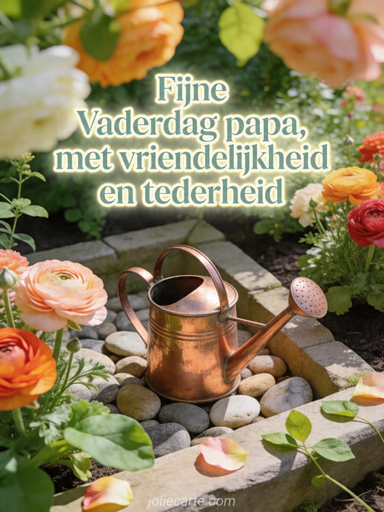 Stuur een teder gedicht voor fijne Vaderdag papa met een geïllustreerde tuinhoek, een koperen gieter, gladde stenen, gelaagde ranonkelbloemen en frisse bladeren in een kalm vrolijk palet. Ontdek ook een vaderdagkaart papa, een gratis Vaderdagkaart of fijne vaderdag papa afbeelding.