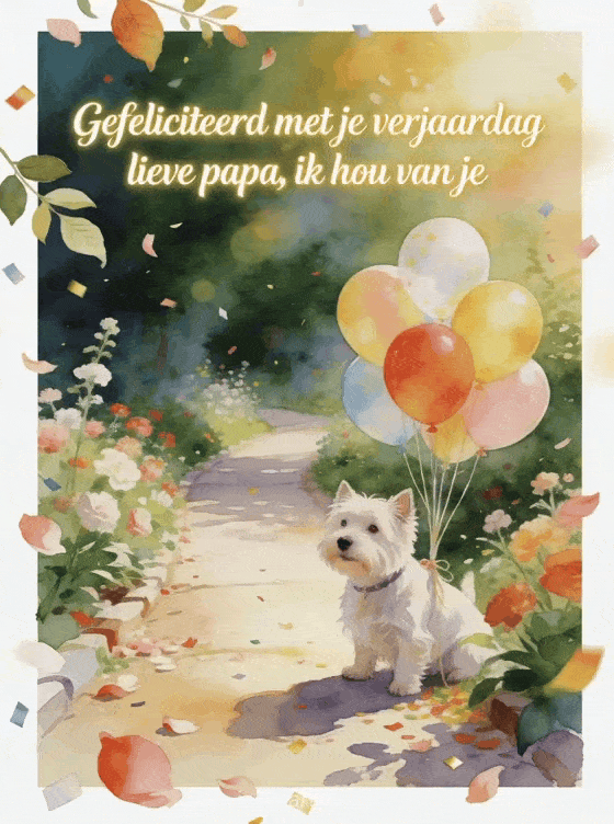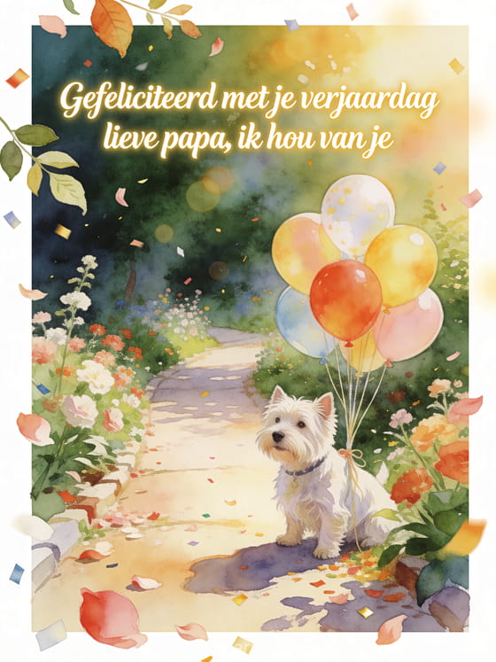 Stuur een gedicht fijne verjaardag lieve papa met verfijnde witte kalligrafie, een Westie naast feestelijke ballonnen op een bloeiend tuinpad, bloemblaadjes, bladeren en confetti over de rand. Ontdek ook een verjaardagsgedicht voor papa ik hou van je, een gedicht voor zijn papa voor zijn verjaardag of een gratis verjaardagsgedicht voor papa.
