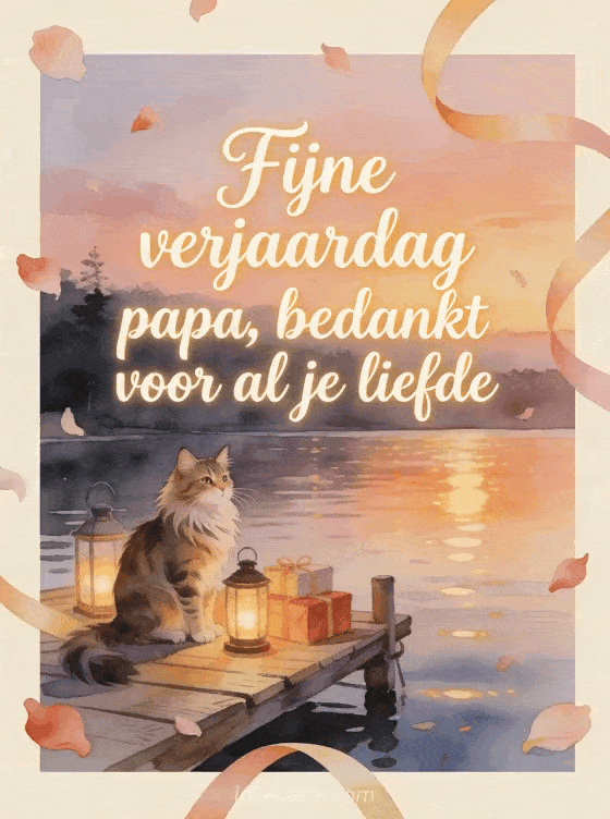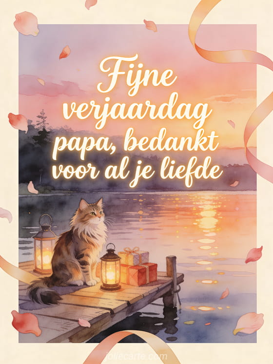 Deel een gedicht fijne verjaardag voor mijn papa met een Maine Coon kat naast lantaarns en ingepakte cadeaus op een houten steiger bij kalm water. Kies ook voor liefdesgedicht voor papa voor zijn verjaardag, verjaardagskaart voor papa of gedicht gedicht papa fijne verjaardag.
