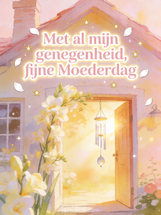 Deel een gastvrije Moederdagkaart met een cottage-deur, verse fresia, een fijne windgong, witte bloemblaadjes en kleine gouden sterren. Ontdek ook een liefdesgedicht voor Moederdag, een Moederdag gedicht of een Moederdag liefdesgedicht.