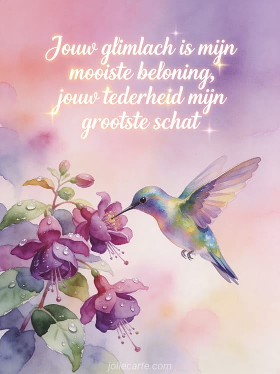 Stuur mama een poëtisch verjaardagsgedicht op deze tedere aquarelkaart met een iriserende kolibrie bij fuchsia bloemen. Bekijk ook tekst verjaardag mama of verjaardag mama.