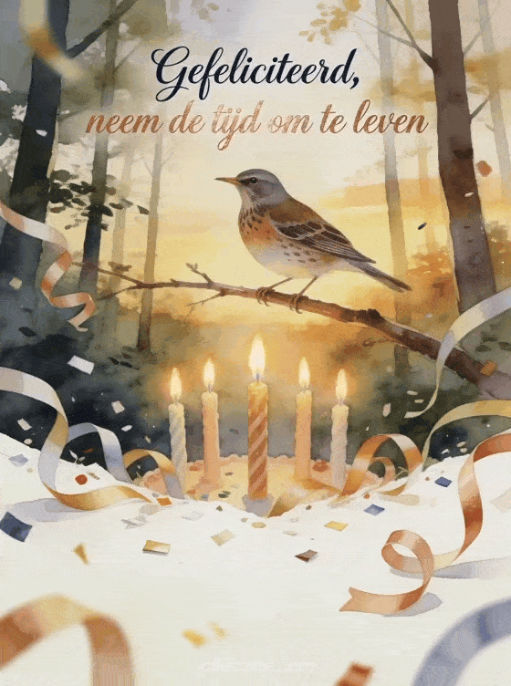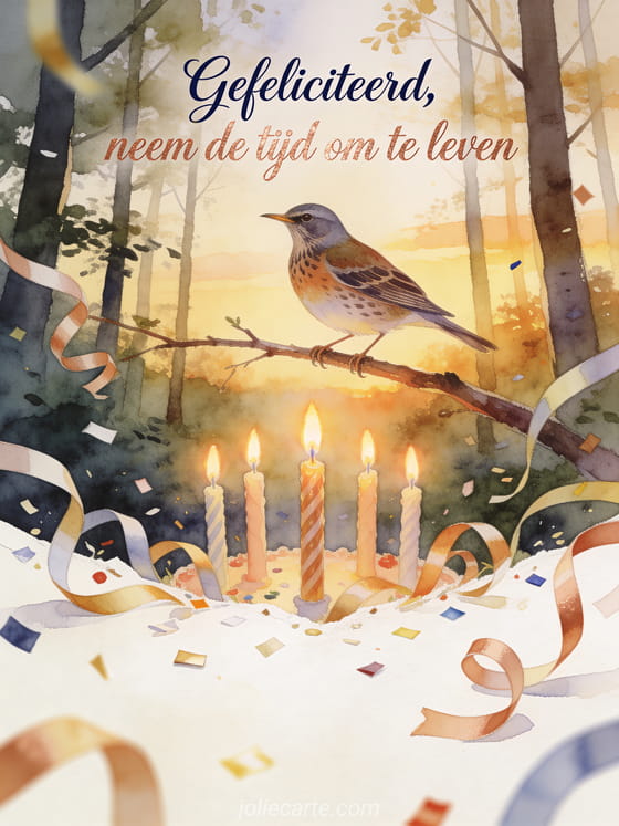 Stuur een rustige verjaardagsboodschap met een lijster op een tak boven brandende kaarsen. Linten, confetti en een gouden aquarelbos maken een zachte viering rond de wens om de tijd te nemen om te leven. Ontdek ook verjaardagsgedicht voor mijn zoon, verjaardagsgedicht voor mijn zoon of gefeliciteerd mijn volwassen zoon.