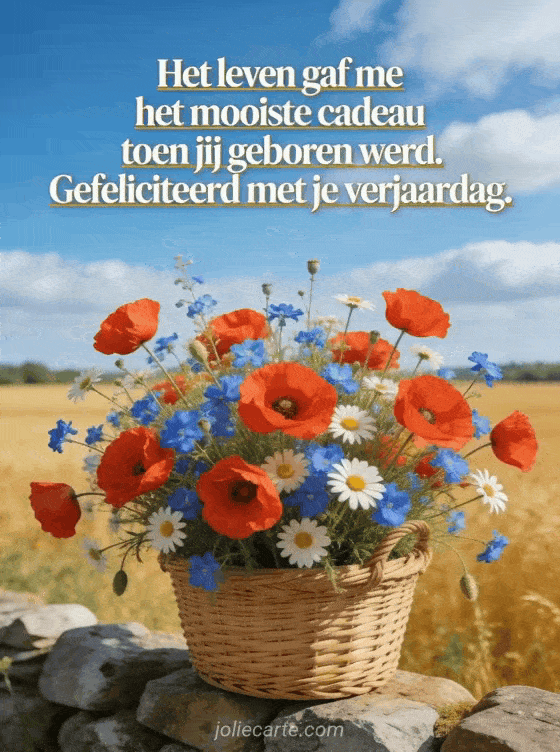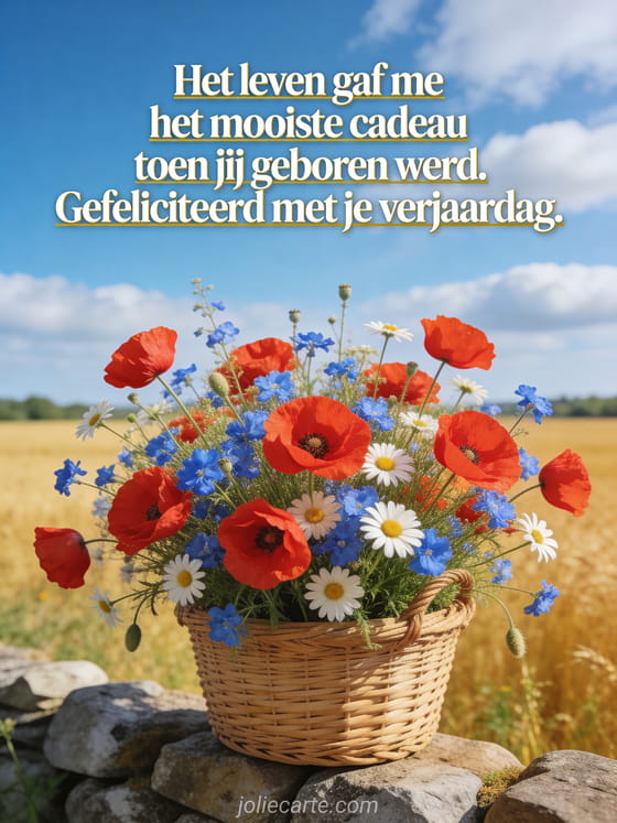 Vertel hem hoe bijzonder hij voor je is op zijn verjaardag. Een prachtig landelijk boeket rode klaprozen, korenbloemen en madelieven in een rieten mand op een stenen muurtje met een gouden veld op de achtergrond en een blauwe hemel. Ontdek ook een verjaardagsbrief voor mijn zoon of een tekst verjaardag volwassen zoon.