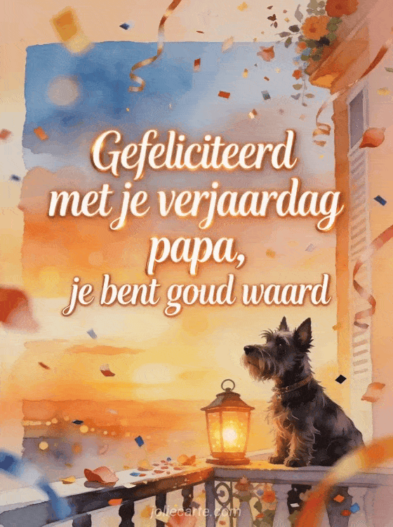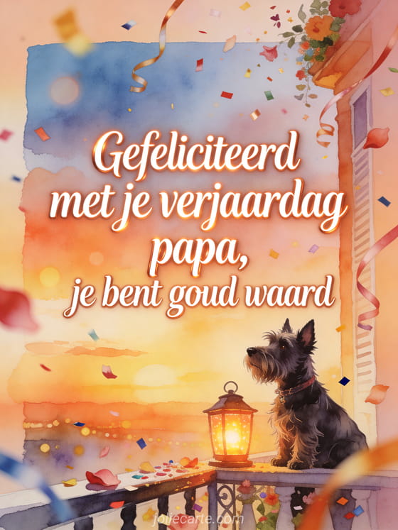 Stuur een gedicht voor zijn papa voor zijn verjaardag met lichtgevend ivoorkleurig schrift, een Schotse terriër naast een lantaarn op een feestelijk balkon, bloemblaadjes, slingers en confetti over de rand. Ontdek ook een gratis verjaardagsgedicht voor papa, een gefeliciteerd met je verjaardag papa ik hou van je gif of een gefeliciteerd met je verjaardag papa verjaardagskaart.