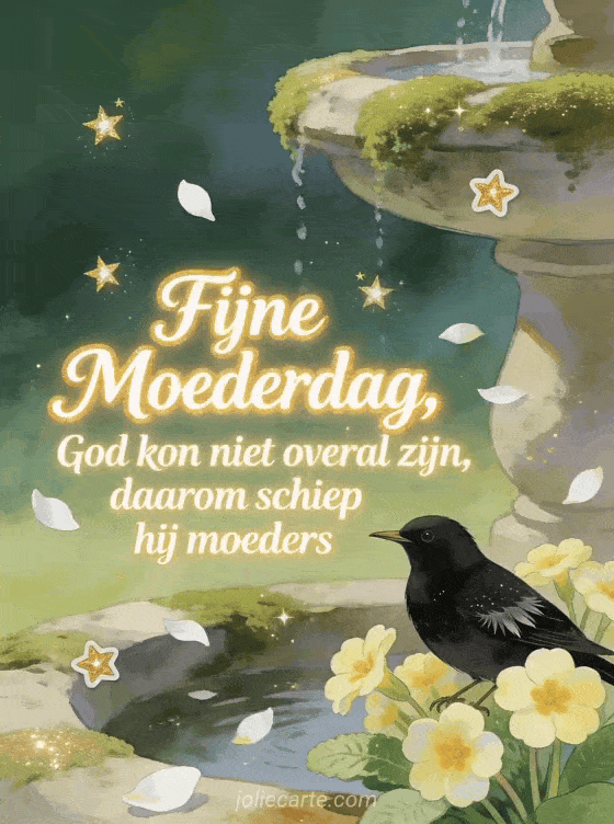 Deel een feestelijke Moederdagkaart met lichtgevend schrift, gouden sterren, witte bloemblaadjes, een merel tussen primula's en een bemoste stenen fontein. Ontdek ook Moederdagafbeeldingen, een Moederdagtekening of goedemorgen en fijne Moederdag.