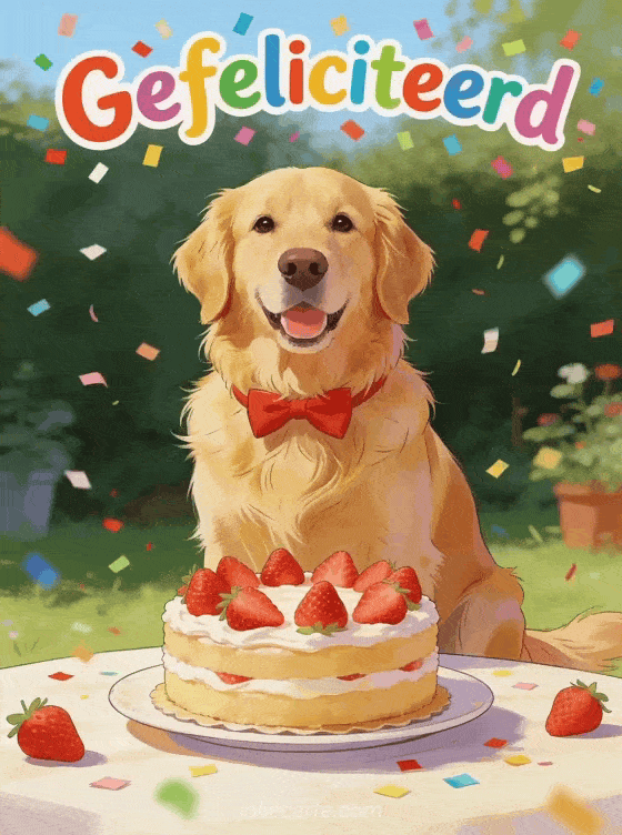 gefeliciteerd animated gif Een vrolijke verjaardagsgroet met een lieve golden retriever en feestconfetti.