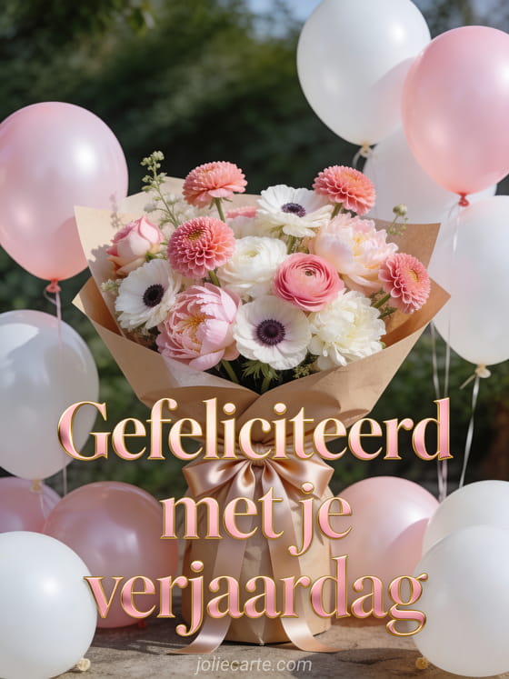Verrast haar met een luxueus bloemenboeket op haar verjaardag. Roze ranonkels, witte pioenrozen en anemonen in kraftpapier met een satijnen strik, omgeven door roze en witte ballonnen in zacht ochtendlicht. Ontdek ook een gif gefeliciteerd verjaardag vrouw humor of een grap verjaardag vrouw.
