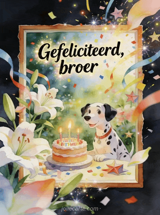Vier je broer met een levendige verjaardagsgroet vol aquarelglans, een speelse dalmatiër en een taart met kaarsjes in een bloeiende lelietuin. Je kunt ook een gefeliciteerd broer gif, een gefeliciteerd mijn kleine broer gif of een verjaardagskaart voor een broer sturen.