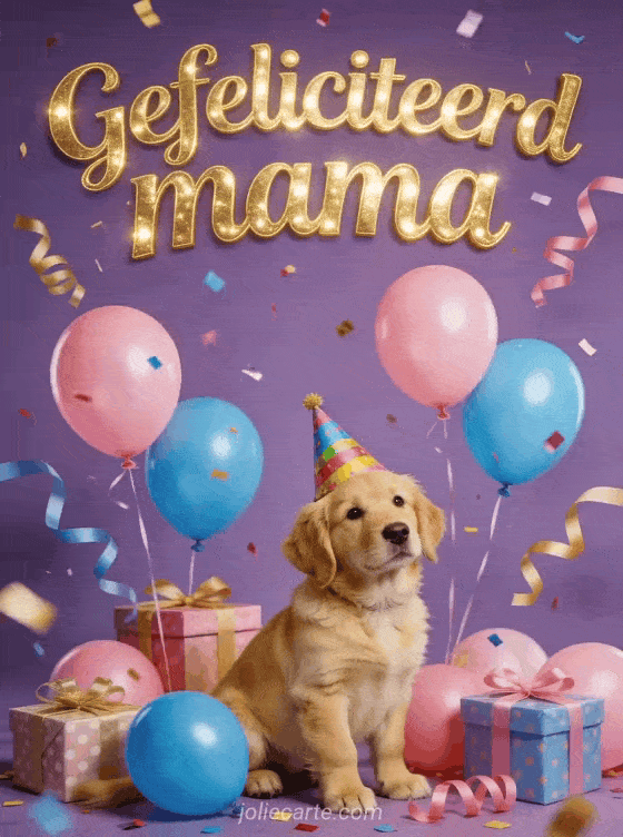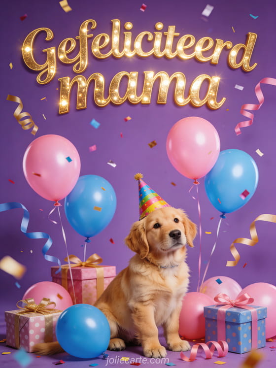 Stuur mama dubbel gefeliciteerd met deze vrolijke kaart van een golden retriever pup met een feestmuts omgeven door roze en blauwe ballonnen en cadeautjes. Bekijk ook gefeliciteerd mama ik hou van je of gedicht verjaardag mama.