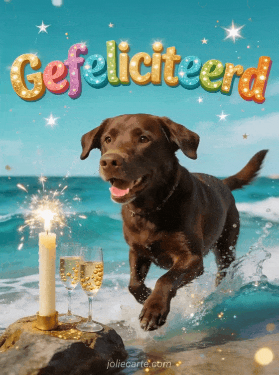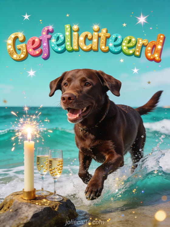 Stuur een energieke gefeliciteerd kaart voor een tienermeisje met een chocolade labrador spelend in de turkooise zee. Bekijk ook een tekst verjaardagskaart tienerjongen gratis of een verjaardagskaart tiener.