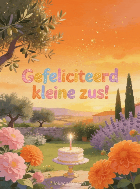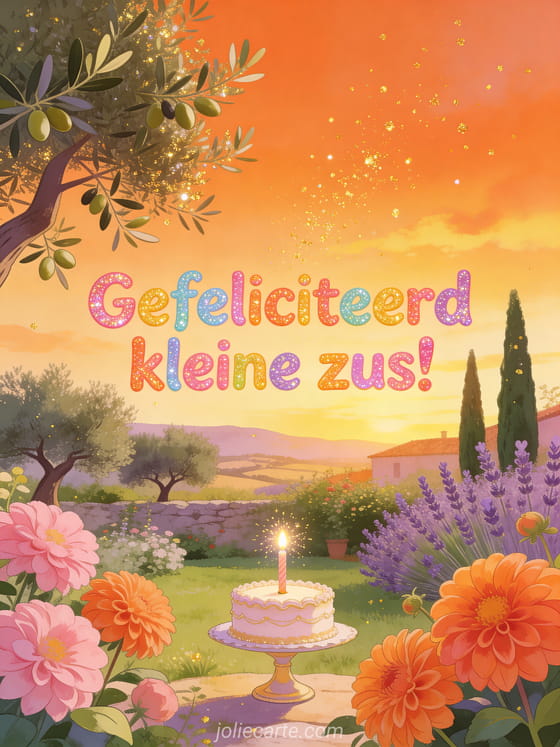 Stuur een stralende gefeliciteerd kaart voor je kleine zus met een Mediterrane tuin vol dahlia's en olijfbomen in de zonsondergang. Bekijk ook een gefeliciteerd grote zus gif of een gefeliciteerd kleine zus ontroerende tekst.