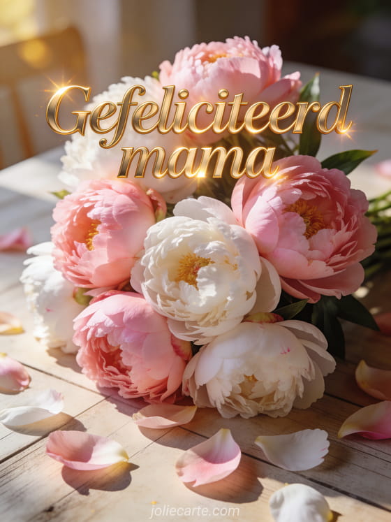 Stuur mama een elegante verjaardagsgroet met dit prachtige boeket roze en witte pioenrozen op een houten tafel in warm ochtendlicht.