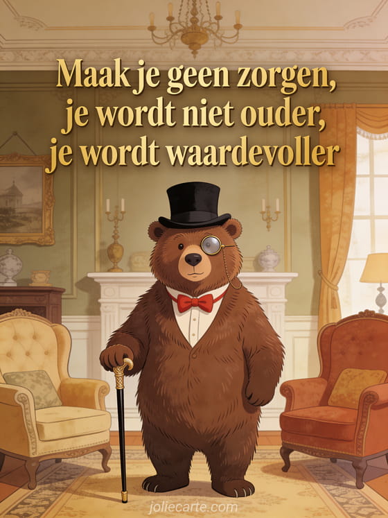 Een deftige bruine beer met monocle, hoge hoed en rode vlinderdas staat in een Victoriaans interieur als echte gentleman. Bekijk ook verjaardagskaart man gratis of grappig hilarisch verjaardag man.