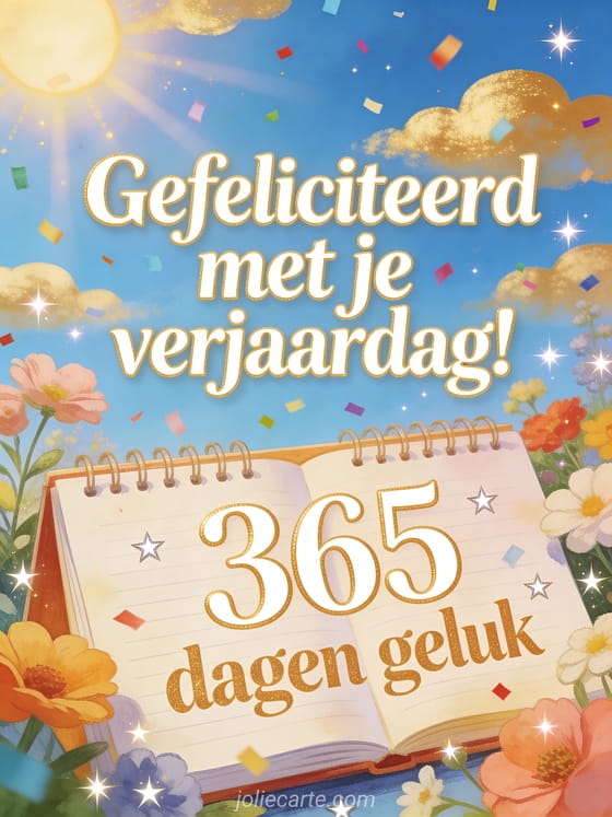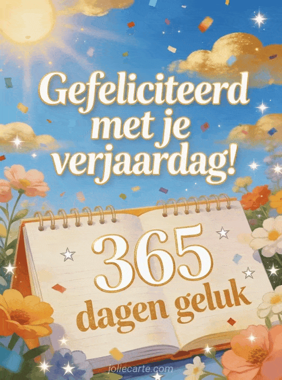 Vier met een inspirerende verjaardagskaart met een bloemenkalender, gouden wolken, fonkelende sterren en feestelijke confetti. Bekijk ook gefeliciteerd met je verjaardag kleurtekening, gefeliciteerd met je verjaardag kat gif en virtuele gefeliciteerd met je verjaardag kaart kikker.