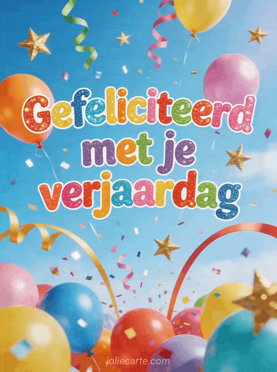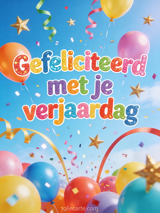Vier groots met deze levendige verjaardagskaart vol ballonnen, slingers, gouden sterren en sprankelende confetti. Bekijk ook gefeliciteerd met je verjaardag kat, afbeelding van gefeliciteerd met je verjaardag mijn mooie en gefeliciteerd met je verjaardag op het water.