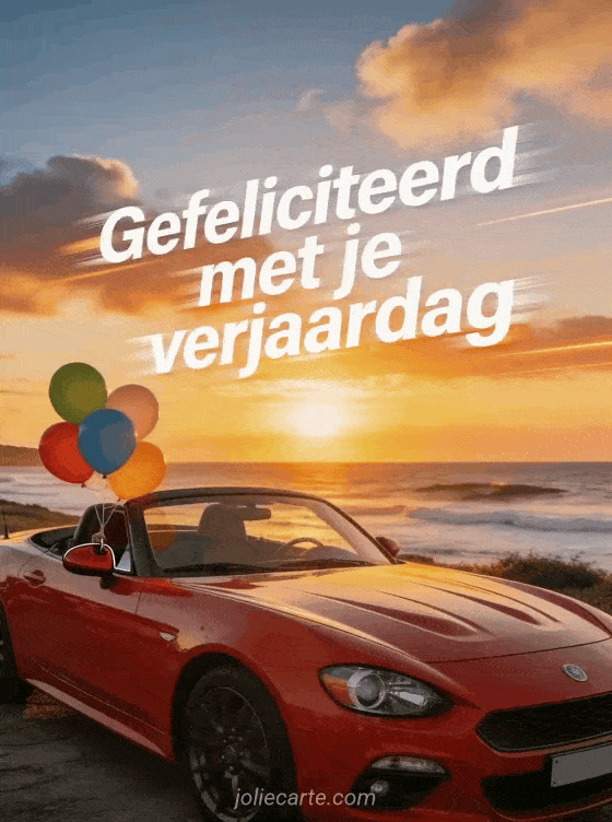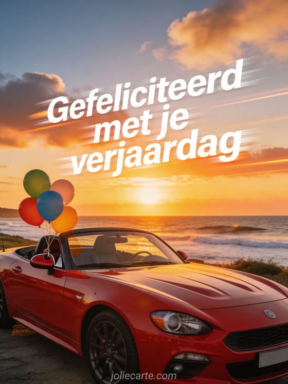 Vier met een auto-verjaardagskaart met rode cabrio, zeehorizon, ballonnen en gouden vrijheid bij zonsondergang. Bekijk ook rustige gefeliciteerd met je verjaardag, gefeliciteerd met je verjaardag bloemen natuur en gefeliciteerd met je verjaardag met coronavirus mondkapje.