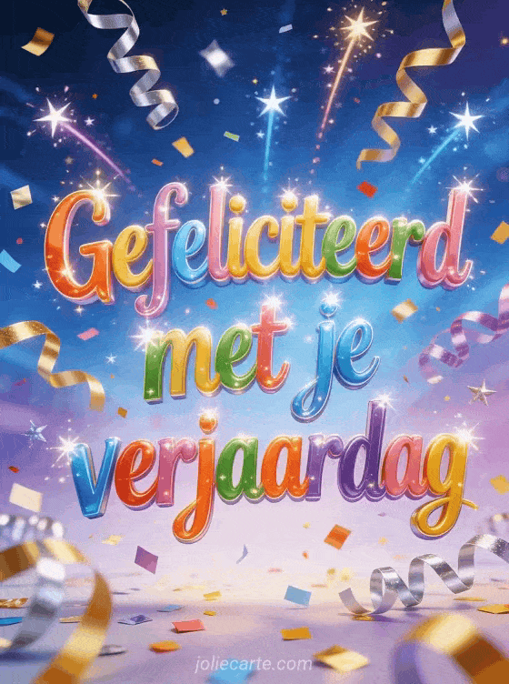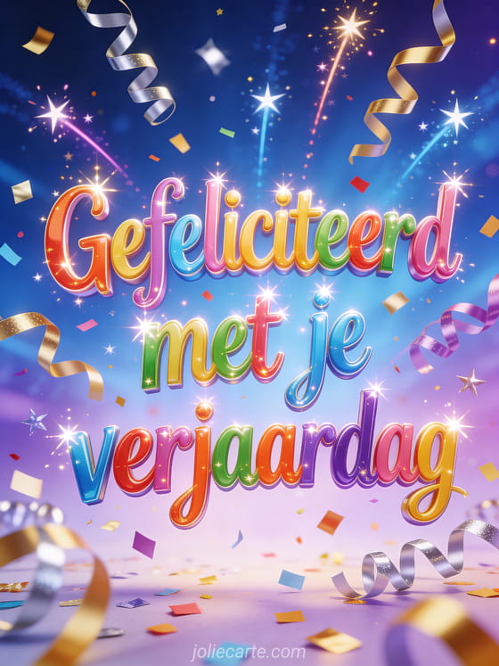 Breng feestgevoel met deze uitbundige verjaardagskaart vol gouden confetti, slingers en fonkelende sterren op een levendige achtergrond. Bekijk ook bloem gefeliciteerd met je verjaardag bloemen, afbeelding gefeliciteerd met je verjaardag met bloemen en gefeliciteerd met je verjaardag muzikaal.