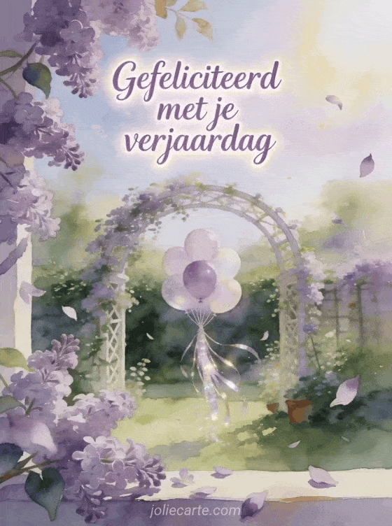 Deel een sierlijke verjaardagsgroet met gloeiend lavendelkleurig schrift, geurende seringtrossen, zwevende bloemblaadjes, een tuinboog, een ballonboeket en glinsterende slingers in zonnig pastellicht. Stuur ook een gefeliciteerd met je verjaardag mama geanimeerde afbeelding, verjaardagswensen voor mama of een sprankelende gefeliciteerd met je verjaardag mama gif.