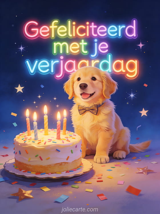 Deel een vrolijke verjaardagskaart met een schattige golden retriever met vlinderdas, zittend voor een taart met brandende kaarsen, confetti en fonkelende sterren op een nachtblauwe achtergrond. Bekijk ook een fijne verjaardag mijn lieve zoon, een bericht fijne verjaardag zoon of een fijne verjaardag fijne verjaardag mijn zoon.