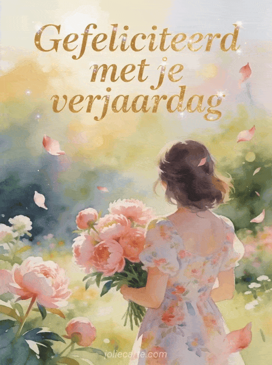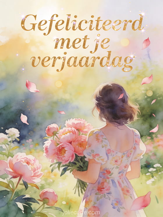 Deel een delicate verjaardagskaart met elegante gouden letters, een jonge vrouw van achteren in een lichte lentetuin, een bloemenjurk, roze pioenrozen, vliegende bloemblaadjes, gouden ochtendlicht en zachte aquarelbokeh. Stuur ook gefeliciteerd met je verjaardag mama afbeeldingen, een verjaardagskaart mama ik hou van je of gefeliciteerd met je verjaardag mama afbeeldingen.