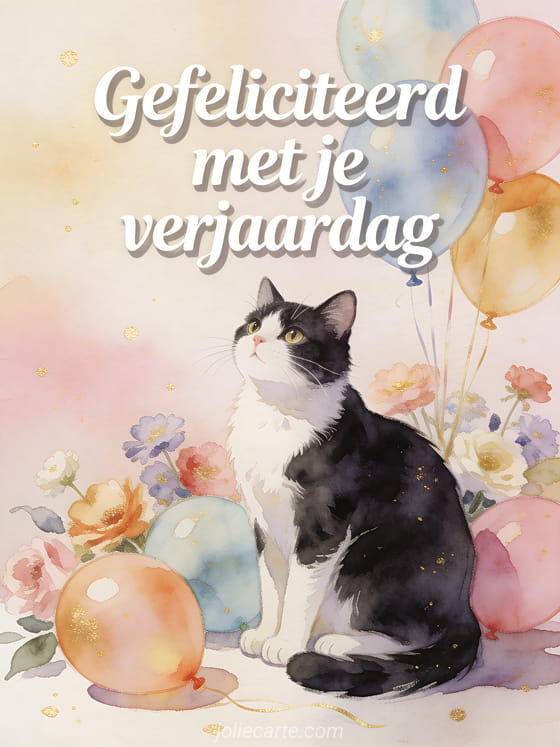 Deel een zachte verjaardagssfeer met deze aquarelillustratie van een zwart-witte kat, bloemen, pasteltinten en kleurrijke ballonnen. Bekijk ook gefeliciteerd met je verjaardag met rode kat, gefeliciteerd met je verjaardag 365 dagen geluk en gefeliciteerd met je verjaardag kleurtekening.
