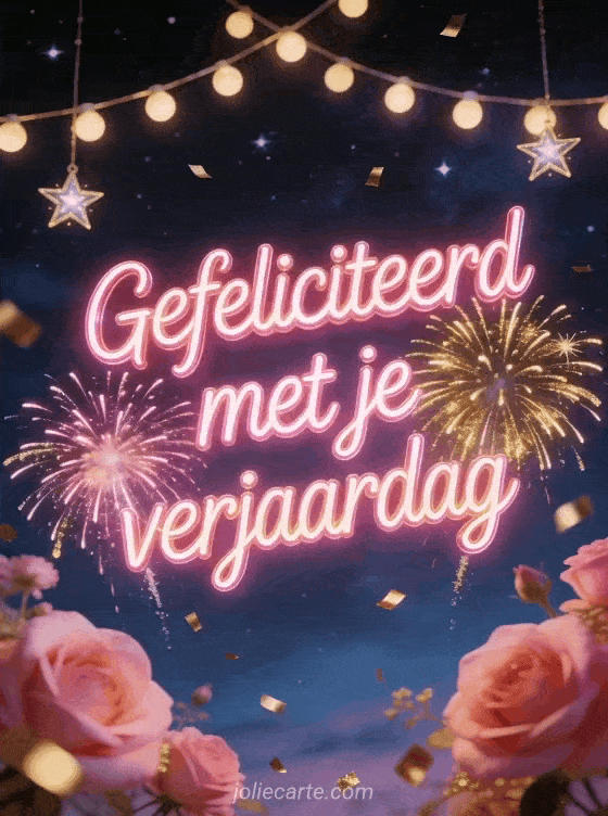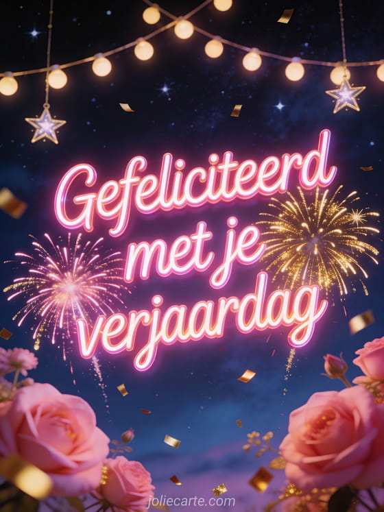 Deel een levendige verjaardagsgroet met zachte roze neonletters, roze en goud vuurwerk in een sterrennacht, hangende lichtslingers, fonkelende sterren en zwevende gouden confetti. Stuur ook een verjaardagskaart mama ik hou van je, gefeliciteerd met je verjaardag mama afbeeldingen of een gefeliciteerd met je verjaardag mama geanimeerde kaart.