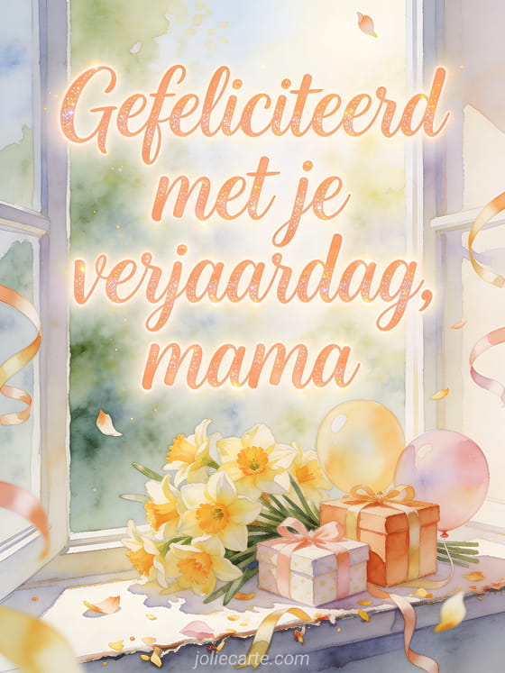Deel een heldere verjaardagswens voor mama met perzikkleurige kalligrafie, fijne glitter, narcissen, geschenkdozen met linten, pastelballonnen, bloemblaadjes en krullende linten op een zonnige vensterbank. Stuur ook een gefeliciteerd met je verjaardag mama geanimeerde kaart, een gefeliciteerd met je verjaardag mama gif of een gefeliciteerd met je verjaardag jonge mama kaart.