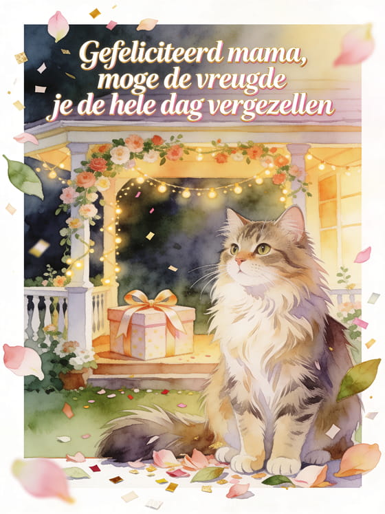 Deel een elegante verjaardagswens voor mama met crèmekleurig schrift, roségouden accenten, bloemblaadjes, bladeren, een Noorse boskat, een geschenkdoos met lint en lichtgevende slingers op een bloemrijke veranda. Stuur ook een fijne verjaardag mama gif, een verjaardag jonge mama gif of een fijne verjaardag mama ik hou van je afbeelding.