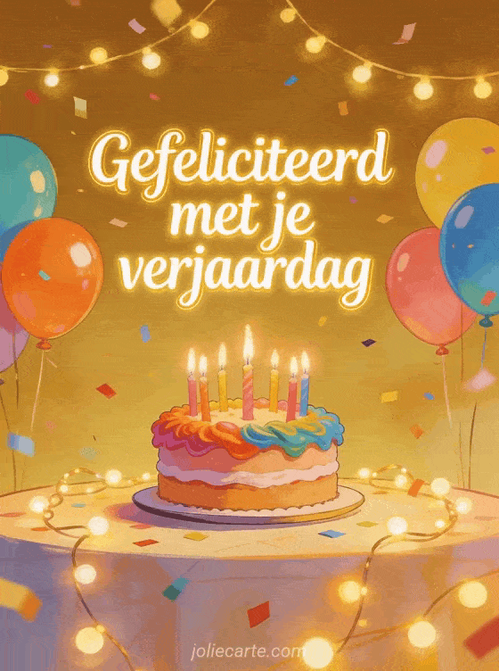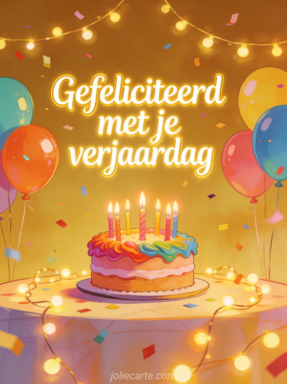 Vier met een gefeliciteerd-kaart vol kleurrijke taart, kaarsen, ballonnen en vliegende confetti in warm gouden licht. Bekijk ook sms om gefeliciteerd met je verjaardag te wensen, brief gefeliciteerd met je verjaardag en gefeliciteerd met je verjaardag chocolade.