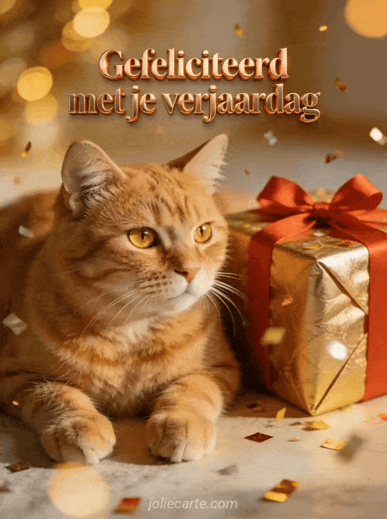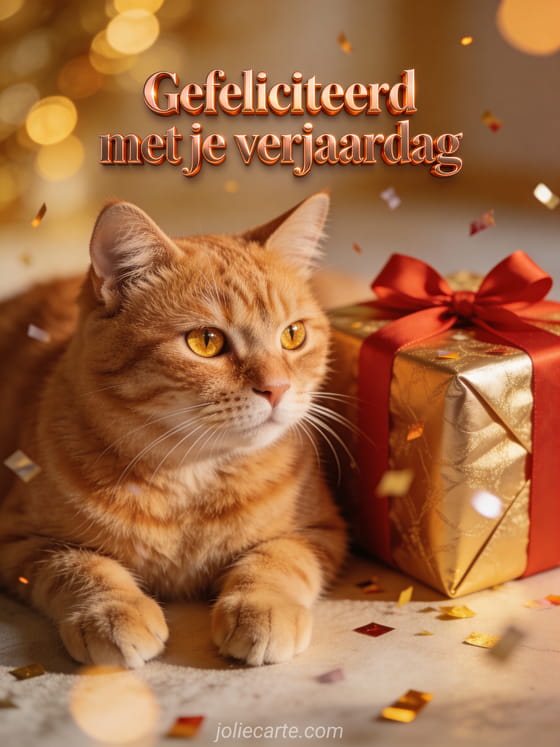 Deel warmte met deze verjaardagskaart met een fotorealistische rode kat naast een gouden cadeau en zacht avondlicht. Bekijk ook gefeliciteerd met je verjaardag 365 dagen geluk, gefeliciteerd met je verjaardag kleurtekening en gefeliciteerd met je verjaardag kat gif.
