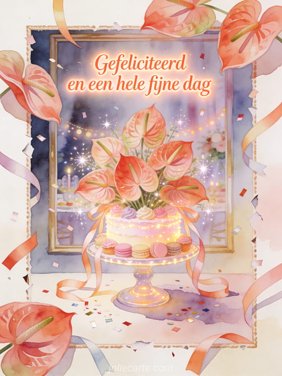 Stuur een lichte verjaardagskaart in aquarel met anthuriums, een gloeiende taartstandaard, pastelkleurig gebak, linten en fonkelende confetti. Je kunt ook een fijne verjaardag voor je vrouwelijke baas, een verjaardagsbericht collega werk of een fijne verjaardag van een vrouwelijke collega op het werk kaart delen.