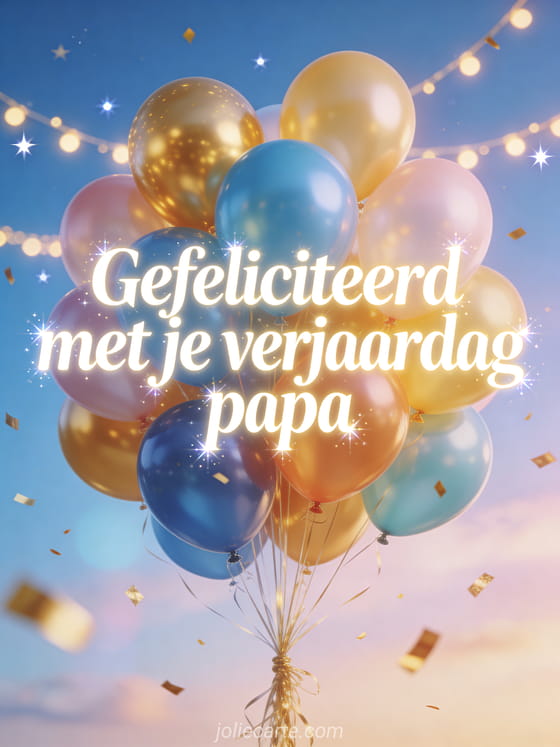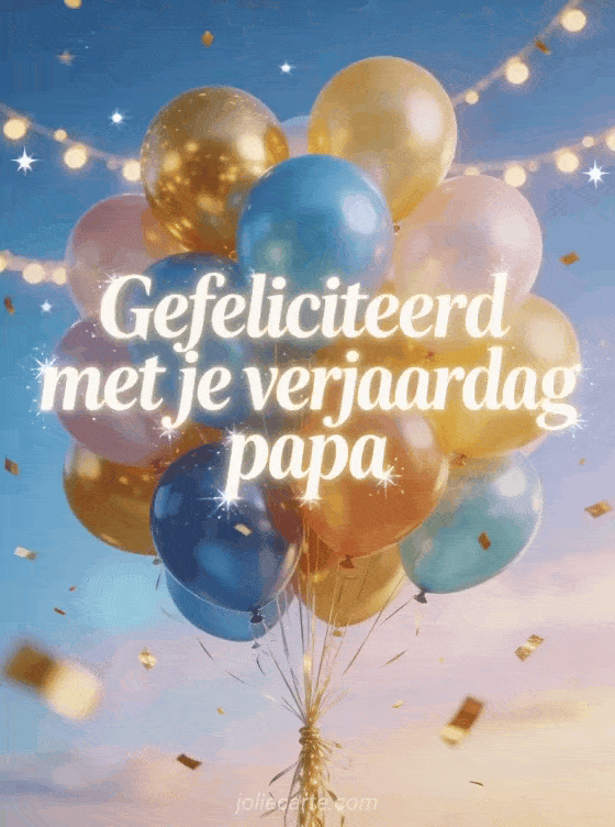 Stuur een heldere gefeliciteerd met je verjaardag papa geanimeerde afbeeldingen kaart met witte tekst, kleurrijke ballonnen in een pastelblauwe lucht, gouden confetti, lichtslingers en fonkelende sterren. Ontdek ook een verjaardagsgedicht papa kind, een gefeliciteerd met je verjaardag papa gif of een gefeliciteerd met je verjaardag papa virtuele kaart.
