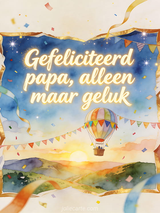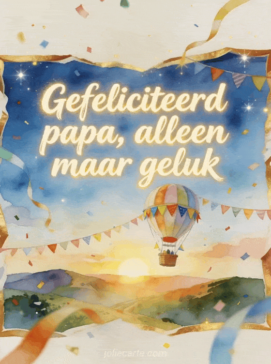 Deel gefeliciteerd met je verjaardag papa in gifstijl met een luchtballon die heldere verjaardagsvlaggetjes boven heuvels bij zonsopgang draagt. Kies ook voor vaders gefeliciteerd met je verjaardag papa ontroerende tekst, gefeliciteerd met je verjaardag papa fotomontage of gefeliciteerd met je verjaardag papa tekst.
