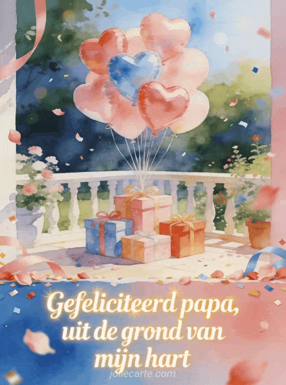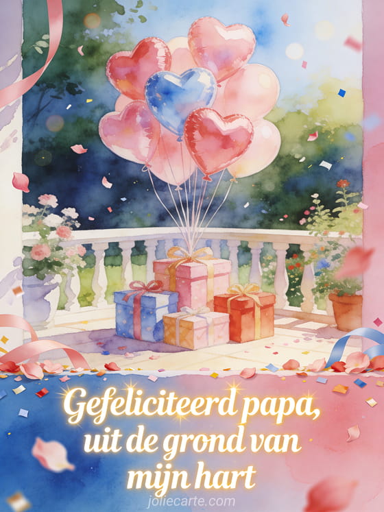 Deel gefeliciteerd met je verjaardag papa hart met een boeket hartvormige ballonnen boven ingepakte cadeaus op een helder tuinterras. Kies ook voor gefeliciteerd met je verjaardag papa auto, gefeliciteerd met je verjaardag papa kalligrafie of ik hou van je gefeliciteerd met je verjaardag papa.