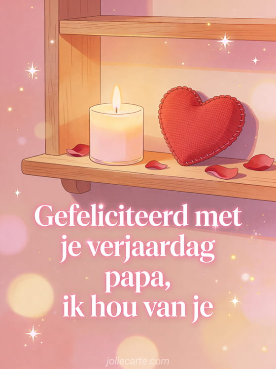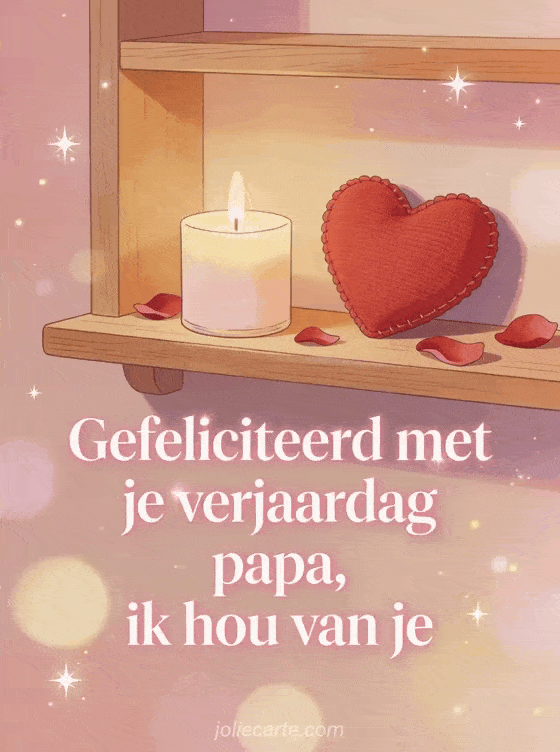 Stuur een gefeliciteerd met je verjaardag papa ik hou van je gif met zachtroze lichtgevende tekst, een klein rood stoffen hart op een houten plank, een brandende kaars, rozenblaadjes en warm gedimd licht. Ontdek ook een gefeliciteerd met je verjaardag papa verjaardagskaart, een verjaardagsbrief voor zijn papa of een gefeliciteerd stiefpapa kaart.