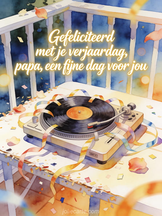 Deel gefeliciteerd met je verjaardag papa in kalligrafie met een heldere aquareltafel op een terras, een draaiende platenspeler en feestelijke verjaardagsslingers. Kies ook voor ik hou van je gefeliciteerd met je verjaardag papa, papa's verjaardag of verjaardag papa tekening.