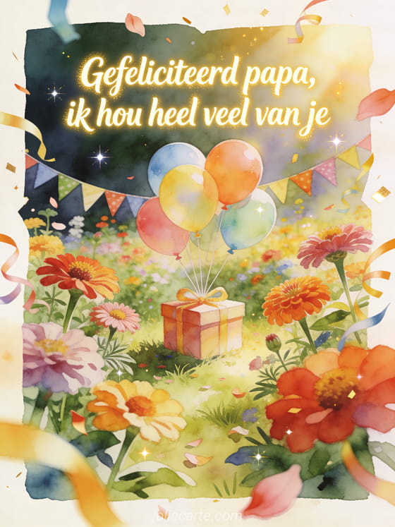 Deel een kindergedicht met gefeliciteerd met je verjaardag papa in een heldere zinniatuin met verjaardagsballonnen, vlaggetjes en een cadeaudoos in het midden. Kies ook voor gedicht fijne verjaardag voor mijn papa, liefdesgedicht voor papa voor zijn verjaardag of verjaardagskaart voor papa.