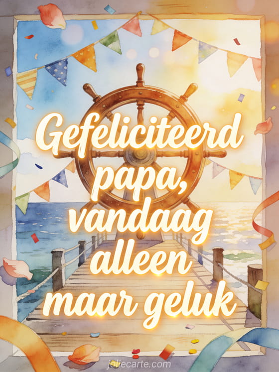 Deel gefeliciteerd met je verjaardag papa simpel met een scheepswiel omringd door verjaardagswimpels op een zonnige pier, in helder aquarellicht aan zee. Kies ook voor gefeliciteerd met je verjaardag papa hart, gefeliciteerd met je verjaardag papa auto of gefeliciteerd met je verjaardag papa kalligrafie.