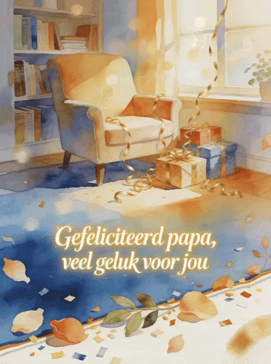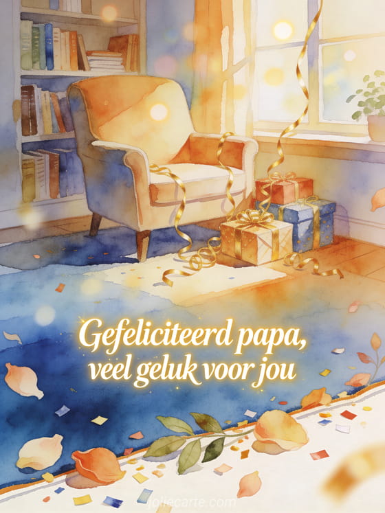 Deel een tekst met gefeliciteerd met je verjaardag papa in een gezellige leeshoek, met een fauteuil, ingepakte cadeaus en gouden slingers. Kies ook voor gefeliciteerd met je verjaardag papa simpel, gefeliciteerd met je verjaardag papa hart of gefeliciteerd met je verjaardag papa auto.