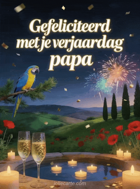 Stuur een gefeliciteerd met je verjaardag papa verjaardagskaart met elegante witte en gouden tekst, Toscaanse heuvels met klaprozen en cipressen, vuurwerk, een ara papegaai, drijvende kaarsen en champagneglazen. Ontdek ook een verjaardagsbrief voor zijn papa, een gefeliciteerd stiefpapa kaart of papa ik wens je een fijne verjaardag.