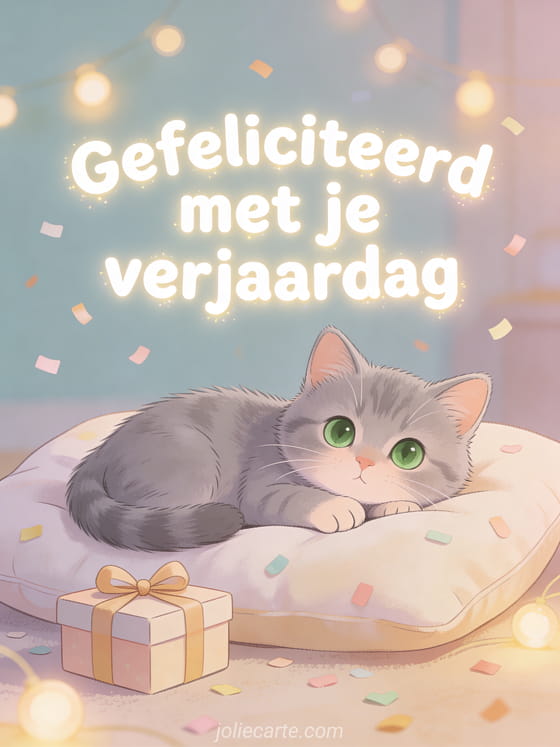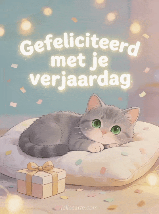 Deel een zoet verjaardagsmoment met deze warme illustratie van een kleine grijze kat op een zacht kussen naast een cadeau en lichte confetti. Bekijk ook gefeliciteerd met je verjaardag gif gratis, bloem gefeliciteerd met je verjaardag bloemen en afbeelding gefeliciteerd met je verjaardag met bloemen.