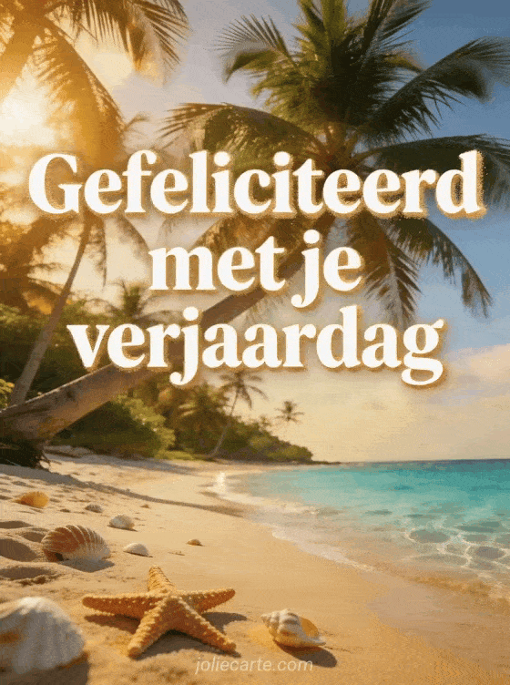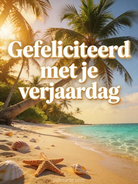 Vier met een strand-verjaardagskaart met kristalhelder water, fijn zand, palmbomen en schelpen in gouden licht. Bekijk ook gefeliciteerd met je verjaardag auto, rustige gefeliciteerd met je verjaardag en gefeliciteerd met je verjaardag bloemen natuur.